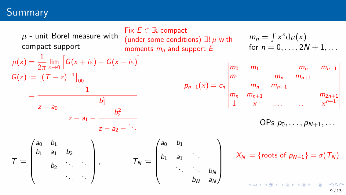 When \(A\) is e.g. a tight binding Hamiltonian, the corresponding spectral measure \(\mu_i\) is a local density of states (LDOS). We can use orthogonal polynomials (and the corresponding Jacobi operator) to approximate the LDOS.